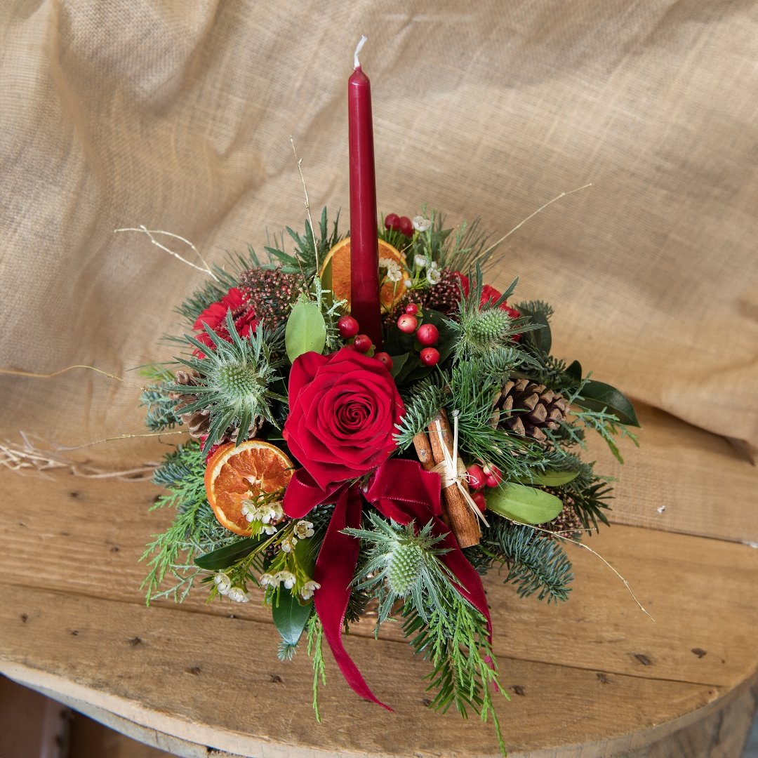 A lovely selection of seasonal Christmassy flowers and foliage in festive tones, arrives ready to display in floral foam in a gold ceramic container that can be used after. Flowers may vary to the one pictured according to availability.