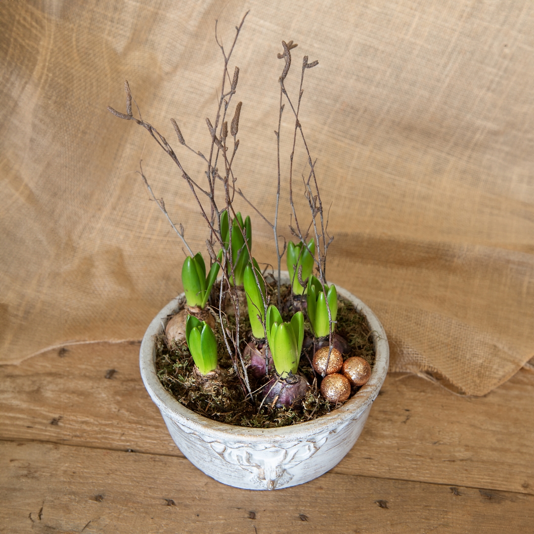 A festive gold ceramic planter filled with mixed colour Hyacinths, with accents of moss and birch twigs.