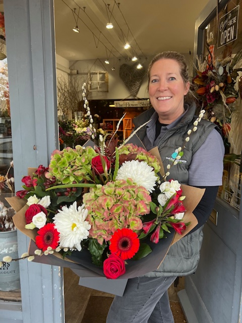 A luxury bouquet of seasonal flowers in reds, green, whites and burgundy. Flowers may vary at time of ordering due to availability. 24 hour notice prior to delivery or collection would be advised.