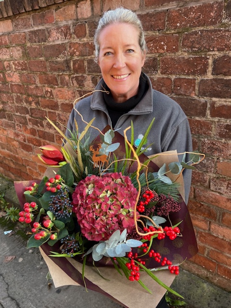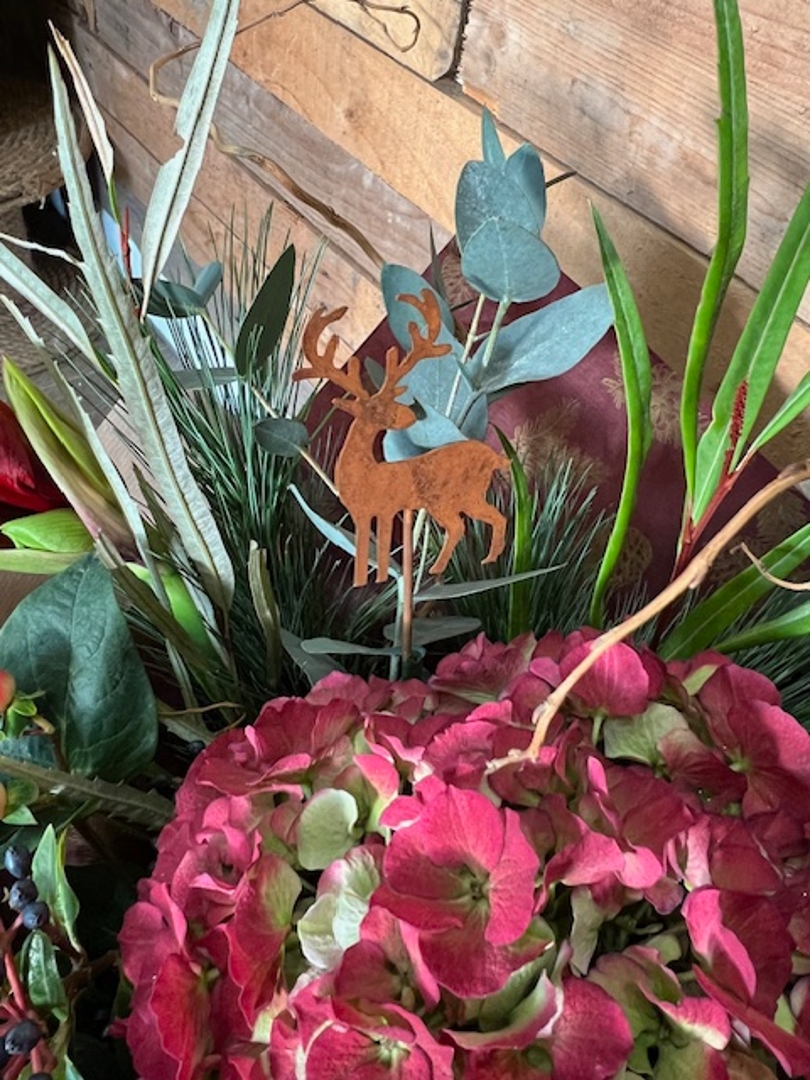 Our luxury Rustic Elegance hand tied is a bespoke design of seasonal festive flowers and foliage. A sophisticated and earthy collection of Amaryllis, Hydrangea, Ilex, Hypericum, Eucalyptus etc and a rustic metal Stag keepsake.