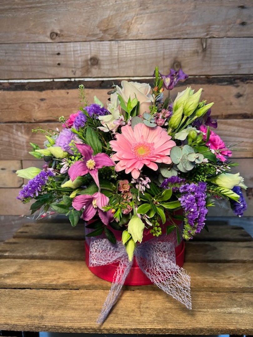 Our Mothers Day Hatbox with a collection of seasonal flowers in pinks, purples, lilacs, whites, presented in a hot pink hatbox which can be utilized after!